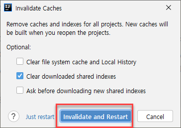 4. "Invalidate and Restart" 를 선택하면 캐시를 삭제하고 IntelliJ 가 재시작됩니다.