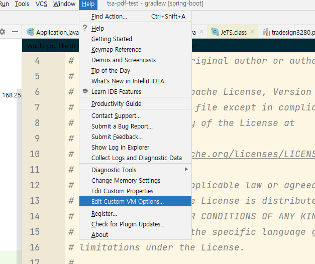 1. Help → "Edit Custom VM options" 를 선택합니다.