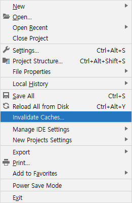 3. 설정이 끝났으면 File → "Invalidate Caches" 를 선택합니다.