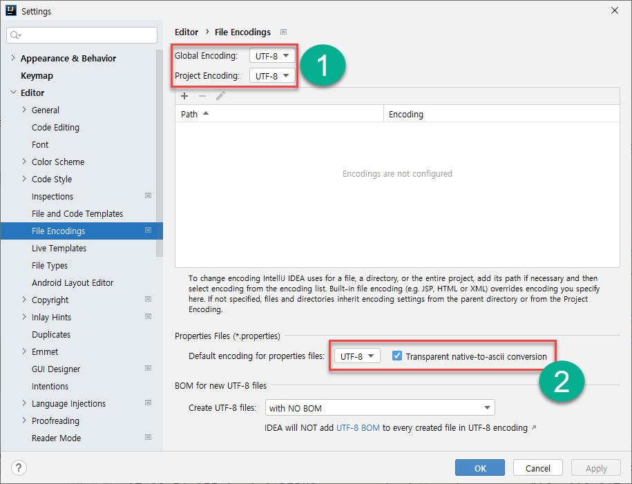 2. Global 과 Project Encoding 을 설정(1)하고 properties 파일의 인코딩(2)도 설정해 줍니다.