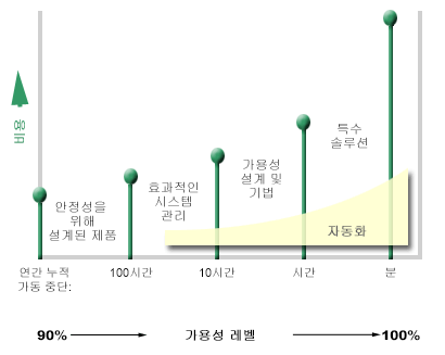 100% 가용성이 필요한 애플리케이션이 있습니까? 대부분의 경우 견고한 프로세스와 시스템 관리 프랙티스를 구현하여 높은 레벨의 가용성을 달성할 수 있습니다. 요구사항이 연속적 가용성에 가까울 수록 더 많은 투자를 해야 합니다. 이러한 유형의 투자를 하기 전에 필요한 가용성 레벨을 확인해야 합니다. 다음 그림은 다양한 기술로 가용성을 향상시킬 수 있지만 그에 따른 비용도 증가함을 보여줍니다. 가용성 레벨 요구사항이 증가하는 경우 클러스터와 같이 복수의 시스템 가용성 솔루션을 고려할 수 있습니다. 수용할 수 있는 가동 휴지시간은 어느 정도인가 각각의 가용성 레벨이 제시하는 가동 휴지시간의 양을 아는 것이 도움이 됩니다. 다음 테이블은 다양한 가용성 레벨에서 예상되는 가동 휴지시간의 양을 표시합니다. 가용성 ..